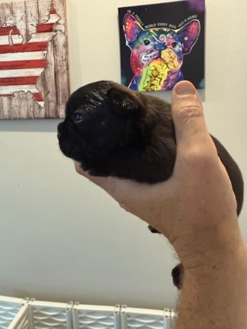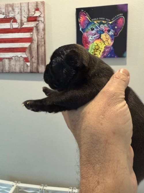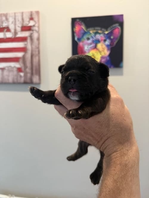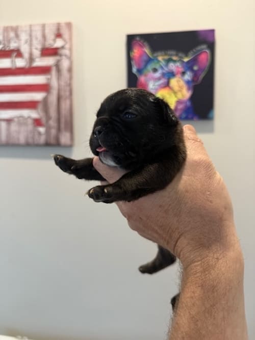 Beautiful Black with white chest male born 4.4.25! Ready to go home now! This little guy has amazing structure, perfect rope and profile. Sired by the famous cocoa and tan Frenchie, Nino Brown! Deposit is 1000.00 with a full price of $3999.00. His sister is also available!