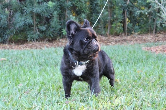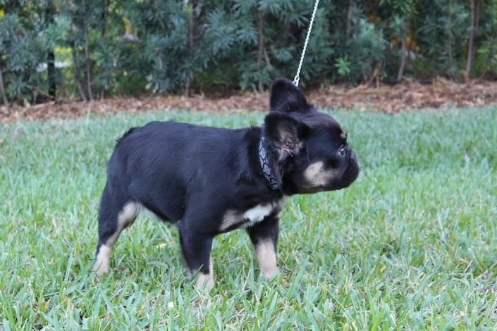 At one time the most popular but now probably the most common is the black and tan French bulldog. Black and tan frenchie pups are stunning in their own right and at one time were very sought after. Now among the most common they are in the medium to low price range, unless they carry other colors and are visual or a carrier of the fluffy gene. All of this is only important to the buyer if they are a Frenchie breeder of course! Finding black and tan french bulldog puppies is not difficult but finding quality always is. There are a dime a dozen puppy mill websites selling low quality pups year round.