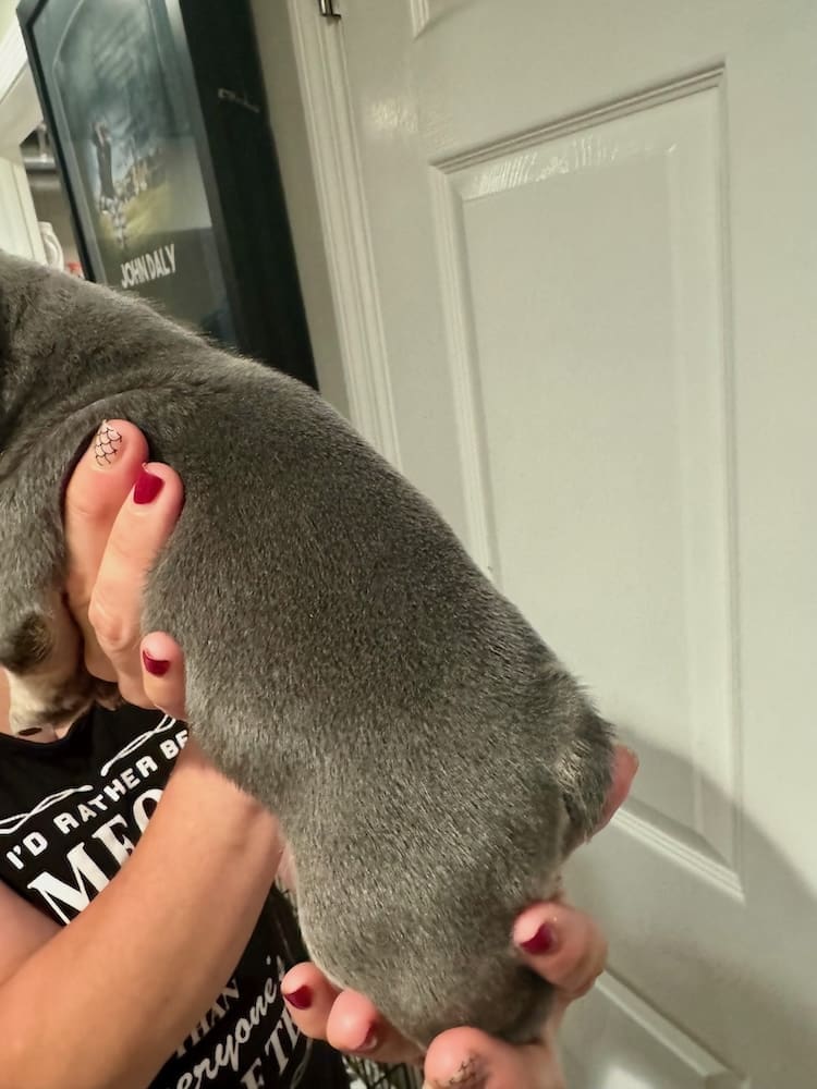 We breed for shorter bodies and legs, not long legged giraffes.  Our pups have flat faces, perfect ropes and centered well set ears.  You will not find a pup with a 4″ extended nose, long tail, long legs and long skinny neck when choosing our program! With our dedicated pup nanny, our pups fly anywhere in the USA directly to your local airport.