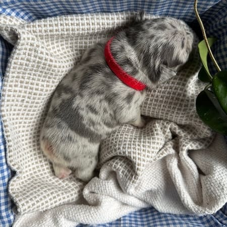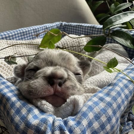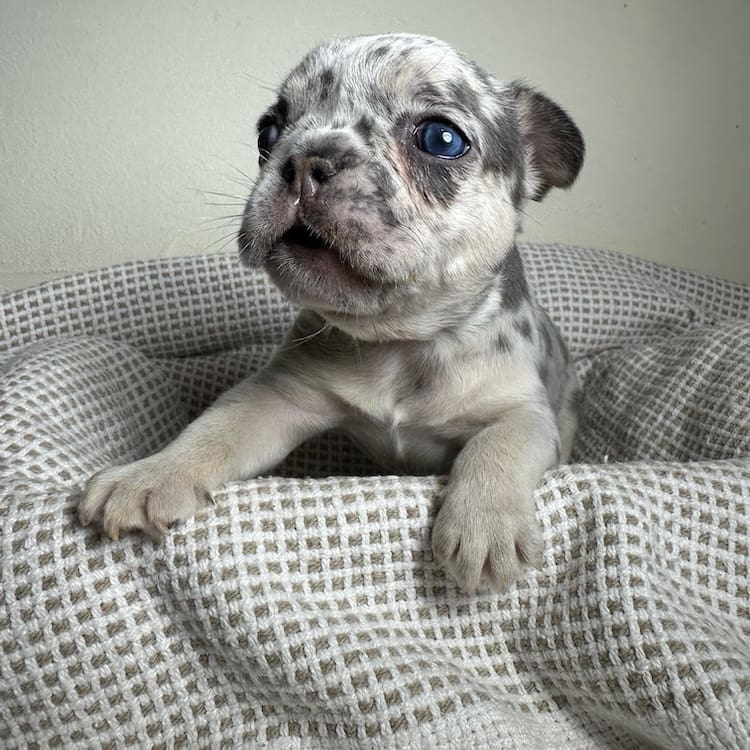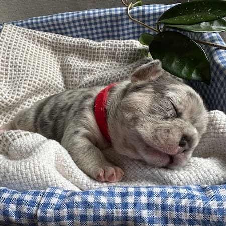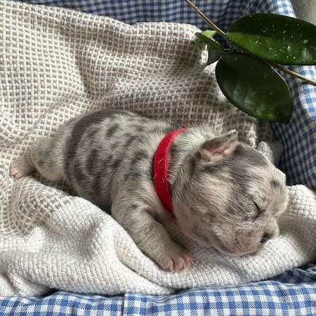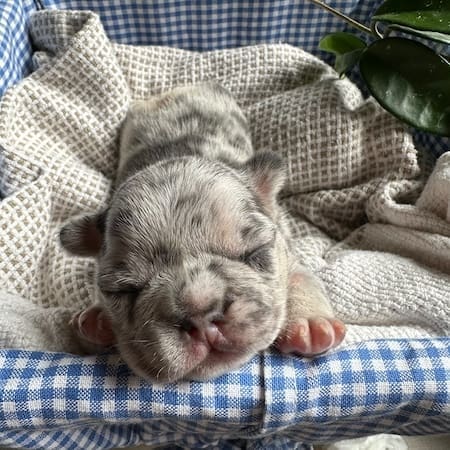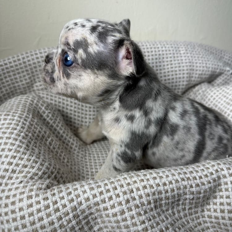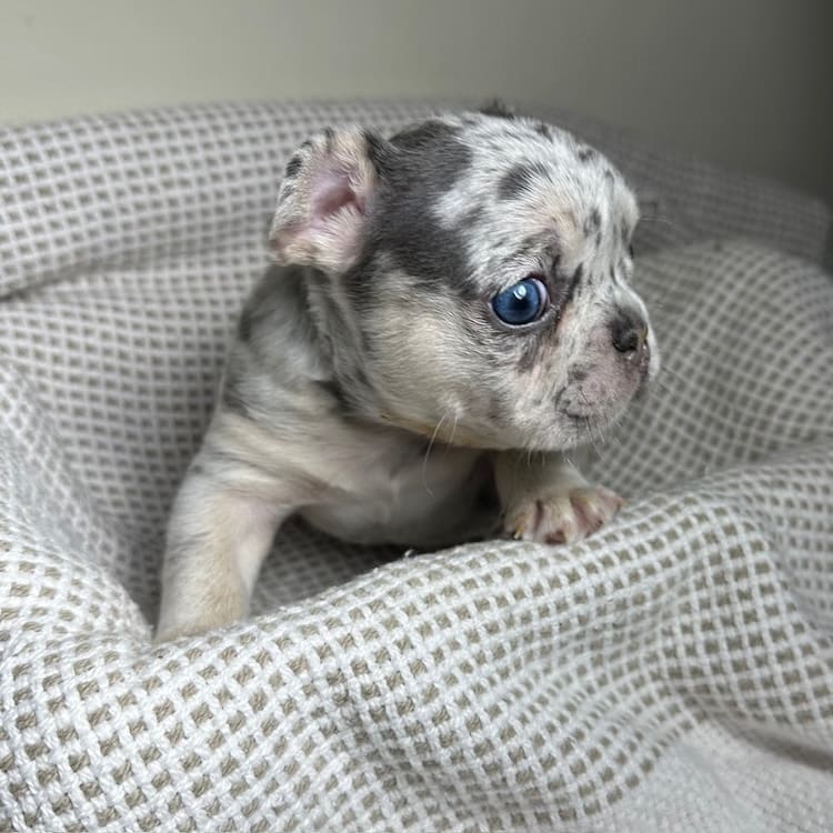 Reservation Price $1000.00 | total with AKC pet registration $6995.00. Stunning Show Quality blue merle carrier boy! This small, and super compact boy was born 3.28.25 and will be ready to home in a few short weeks! He is short, compact, perfect head, side profile, no tail, perfect set eyes, beautiful natural rope over nose. 1000 payment towards purchase price of $5499 including everything with pet AKC registration. Full AKC Registration to breed/show is also available. Mother and Father can be seen below! Your CC will be billed by DesignerFrenchBulldogs.com