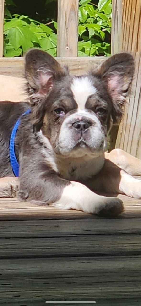 1000 deposit to reserve this Amazing fluffy husky “panda” frenchie female sired by Sonic! She is amazing in every way! A super unique girl, she is calm, sweet and built right! short, compact, big head, super cute, and a fluffy soft coat. Considered a “Panda” or husky panda, this is a one of a kind girl. She will be in the neighborhood of 20 pounds full grown. She can be sold with full AKC or limited pet registration. Her price for pet AKC registration is $6995.00