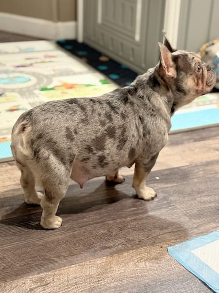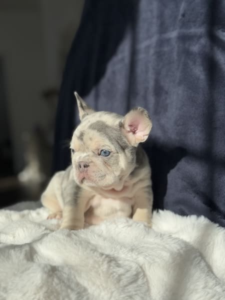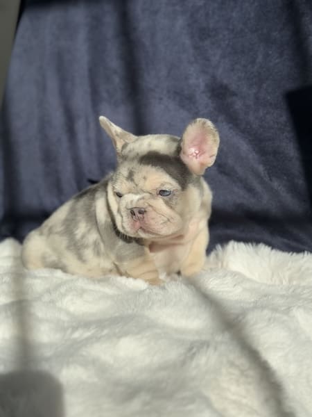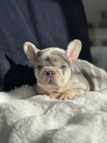 The merle French bulldog can come in many colors and coat types. Most popular are the blue Merle french bulldog, as well as the lilac merle frenchie. Blue merles will be different in look than the solid blue French bulldog. Both are close in color and look with the Lilac being lighter in color. Merle French bulldog puppies are adorable and super unique as no two are every alike!