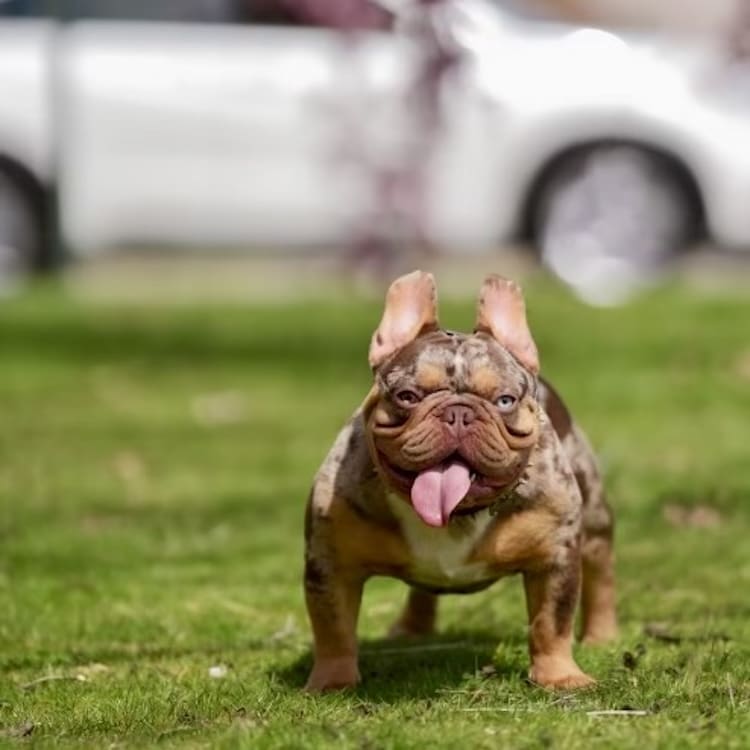 The merle French bulldog can come in many colors and coat types. Most popular are the blue Merle french bulldog, as well as the lilac merle frenchie. Blue merles will be different in look than the solid blue French bulldog. Both are close in color and look with the Lilac being lighter in color. Merle French bulldog puppies are adorable and super unique as no two are every alike!