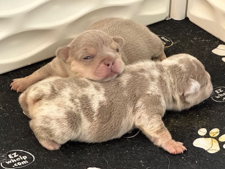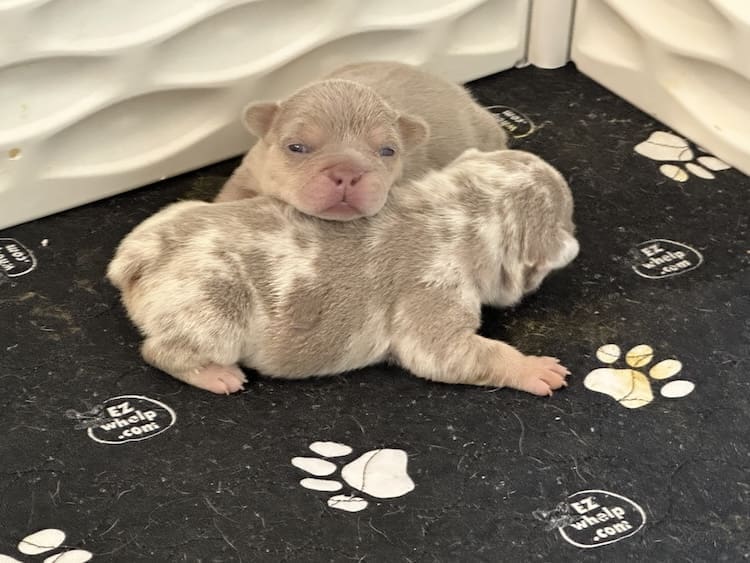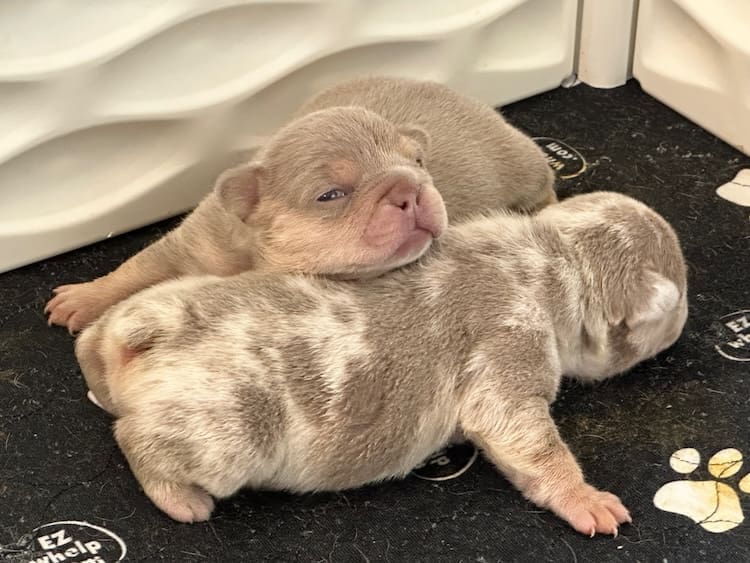 The merle French bulldog can come in many colors and coat types. Most popular are the blue Merle french bulldog, as well as the lilac merle frenchie. Blue merles will be different in look than the solid blue French bulldog. Both are close in color and look with the Lilac being lighter in color. Merle French bulldog puppies are adorable and super unique as no two are every alike!