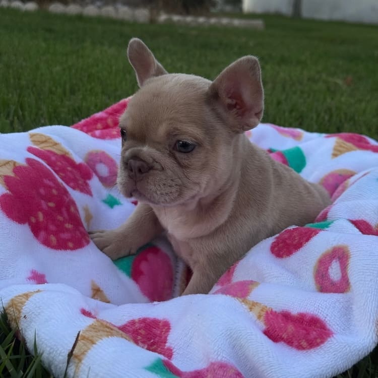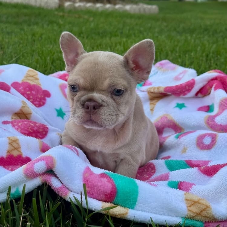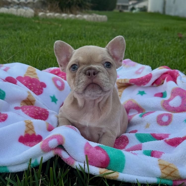 1000.00 reservation for a total price of $6995.00 Gorgeous new shade Isabella Merle Frenchie female! This girl is short, compact, and built right! Perfect rope over the nose, open nasal passages, perfect structure and tail. Sire weighs 21.5 pounds and is a fluffy Isabella and mother 18.5 lbs. Full AKC rights are available as well for those looking to purchase her to show or breed for an extra fee. This little lady is one of the best built blue fawns we have produced in years! Call or text with questions! 609-827-2645. We also offer financing through a partner, to explore financing options, please click here.