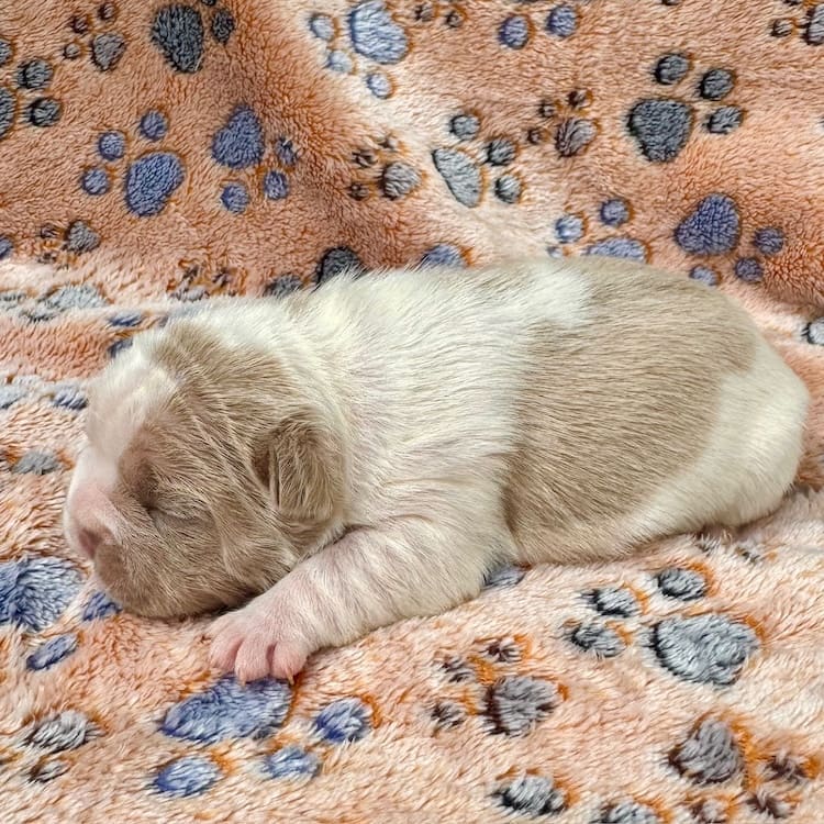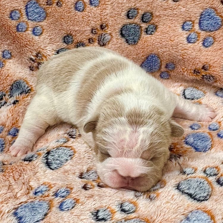 Newshade Isabella Pied girl DOB 9.8.25 Sold as a pet OR with full AKC rights to breed or show. Full price with AKC pet registration is $6995.00 this gal is going to be amazing. Big Rope, Carrying fluffy, Rojo. Daughter of our famous “Milk Dud” Rojo and Tan Big rope boy. Dad is 16 pounds, the smallest working Rojo big rope Rojo and tan carrying fluffy in the USA. Mother is 19 lbs so pups are super short back, short leg, compact with perfect profiles, big ropes and beautiful heads and structure overall.