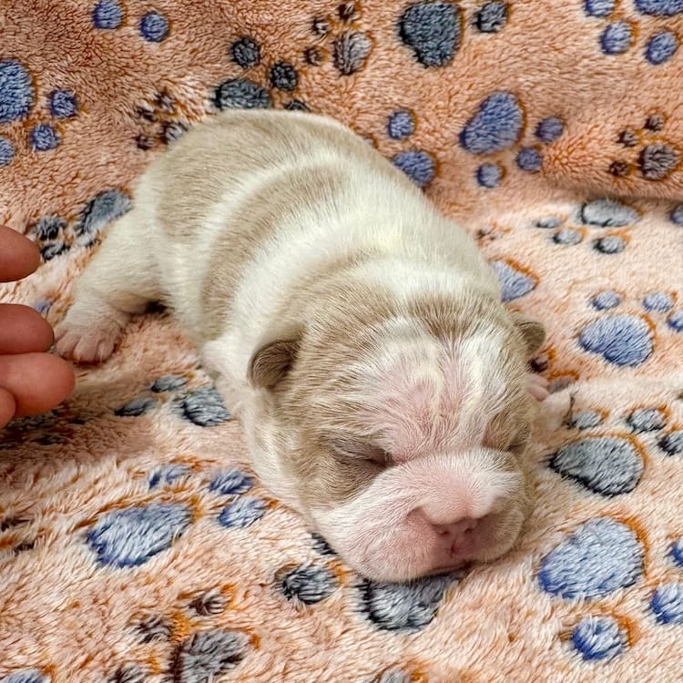 Newshade Isabella Pied girl DOB 9.8.25 Sold as a pet OR  with full AKC rights to breed or show.  Full price with AKC pet registration is $6995.00 this gal is going to be amazing.  Big Rope, Carrying fluffy, Rojo.  Daughter of our famous “Milk Dud” Rojo and Tan Big rope boy.  Dad is 16 pounds, the smallest working Rojo big rope Rojo and tan carrying fluffy in the USA.  Mother is 19 lbs so pups are super short back, short leg, compact with perfect profiles, big ropes and beautiful heads and structure overall.